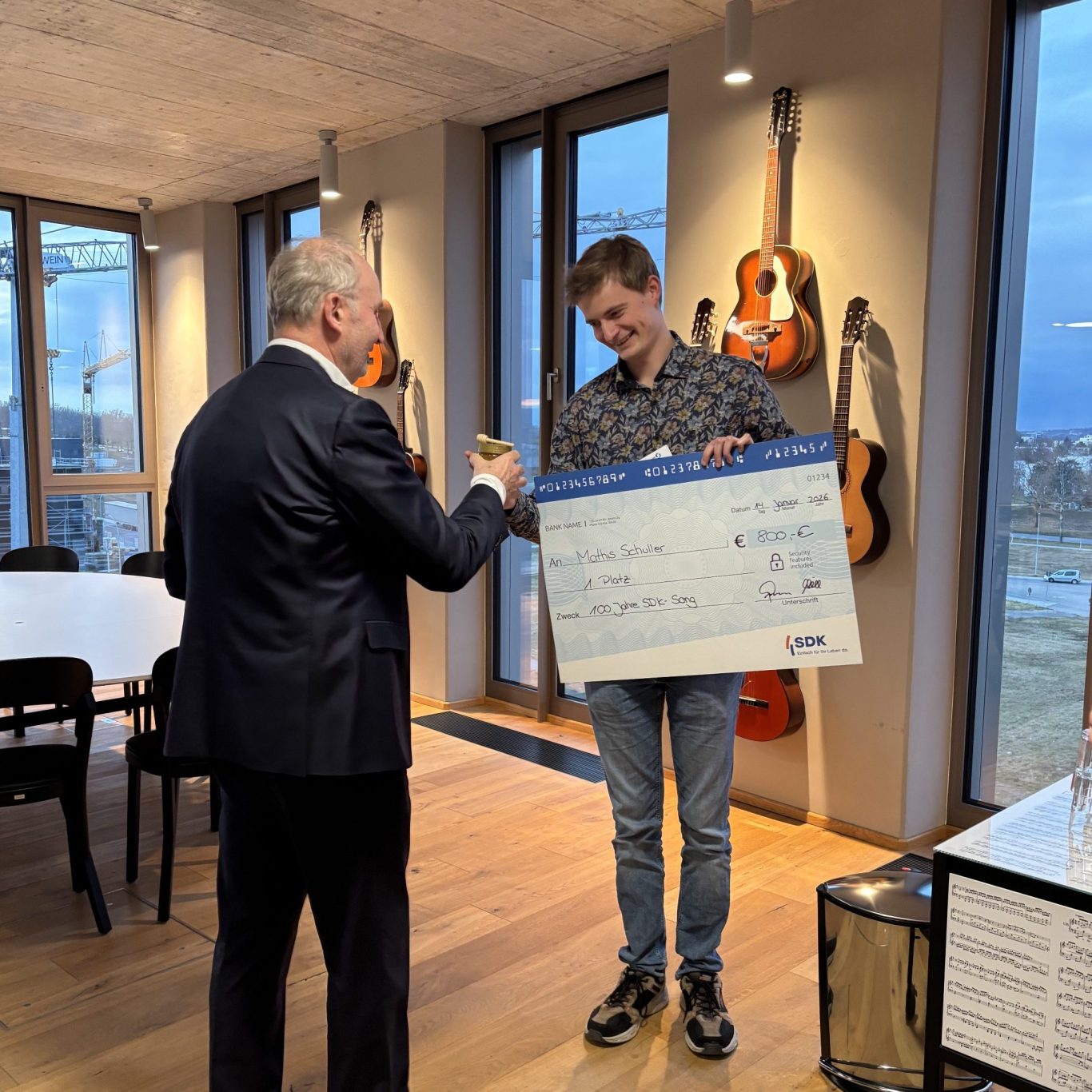 So hat er zum Beispiel im Jahr 2026 den Song zum hundertjährigen Bestehen der Süddeutschen Krankenkasse (SDK) geschrieben. Im Foto links sehen Sie, wie ihm zur Gratulation ein Scheck überreicht wird und er sich sehr darüber freut.